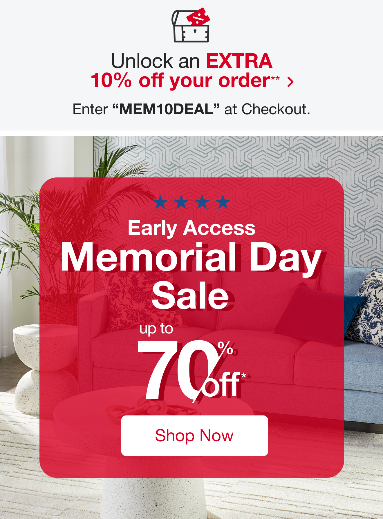 Don't miss huge Memorial Day Savings on sofas, coffee tables & more.