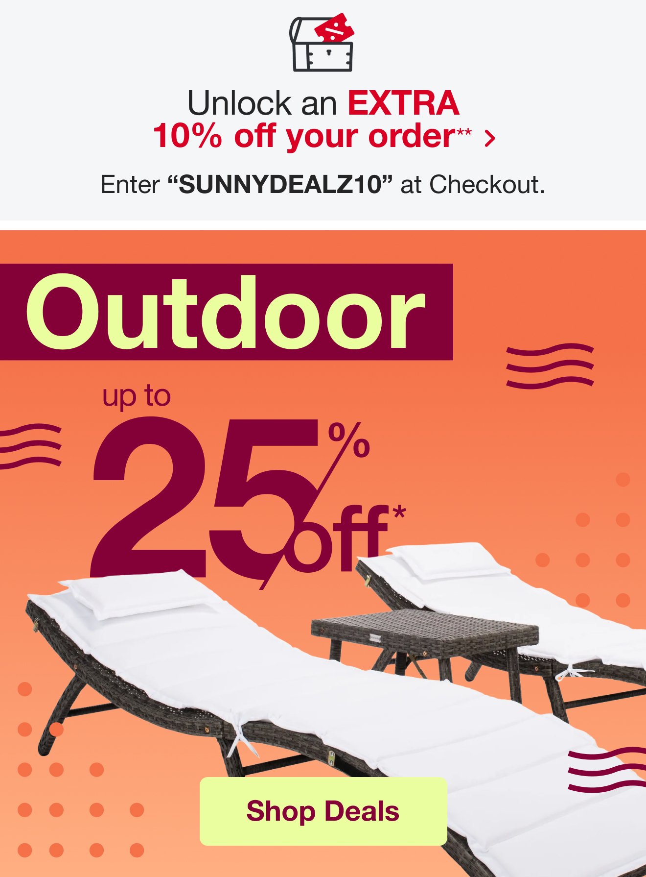 | |  | | | | This message was sent to: kalia1.erieweary@blogger.com | | | | **10% off Coupon may only be used once and cannot be combined with any other offer nor past purchases. For qualifying items, product page price will show, "Today After Coupon". Applies to items in current site promotions. Total discount limited to $5,000. Purchases of gift cards and Welcome RewardsMemberships are not included. Discount appears at checkout. See site for details, exclusions and limitations. Code SUNNYDEALZ10 automatically applies to items in cart at checkout. Not redeemable on bedbathandbeyond.com. Offer subject to end at any time. Offer ends June 03, 2024 11:59 PM MDT. | | | | | *Subject to limitations or restrictions. See site for details | | ºFeatured Products are sponsored ads that are relevant to you. | | | Products and prices subject to change. Offer, products and prices may not be available for international customers. See website for details. | | | | Beyond, Overstock, and Overstock.com are trademarks and service marks of Beyond, Inc. Any trademarks used in connection with products or services appearing on this email or the website are the property of their respective owners. See Terms & Conditions for more information. |