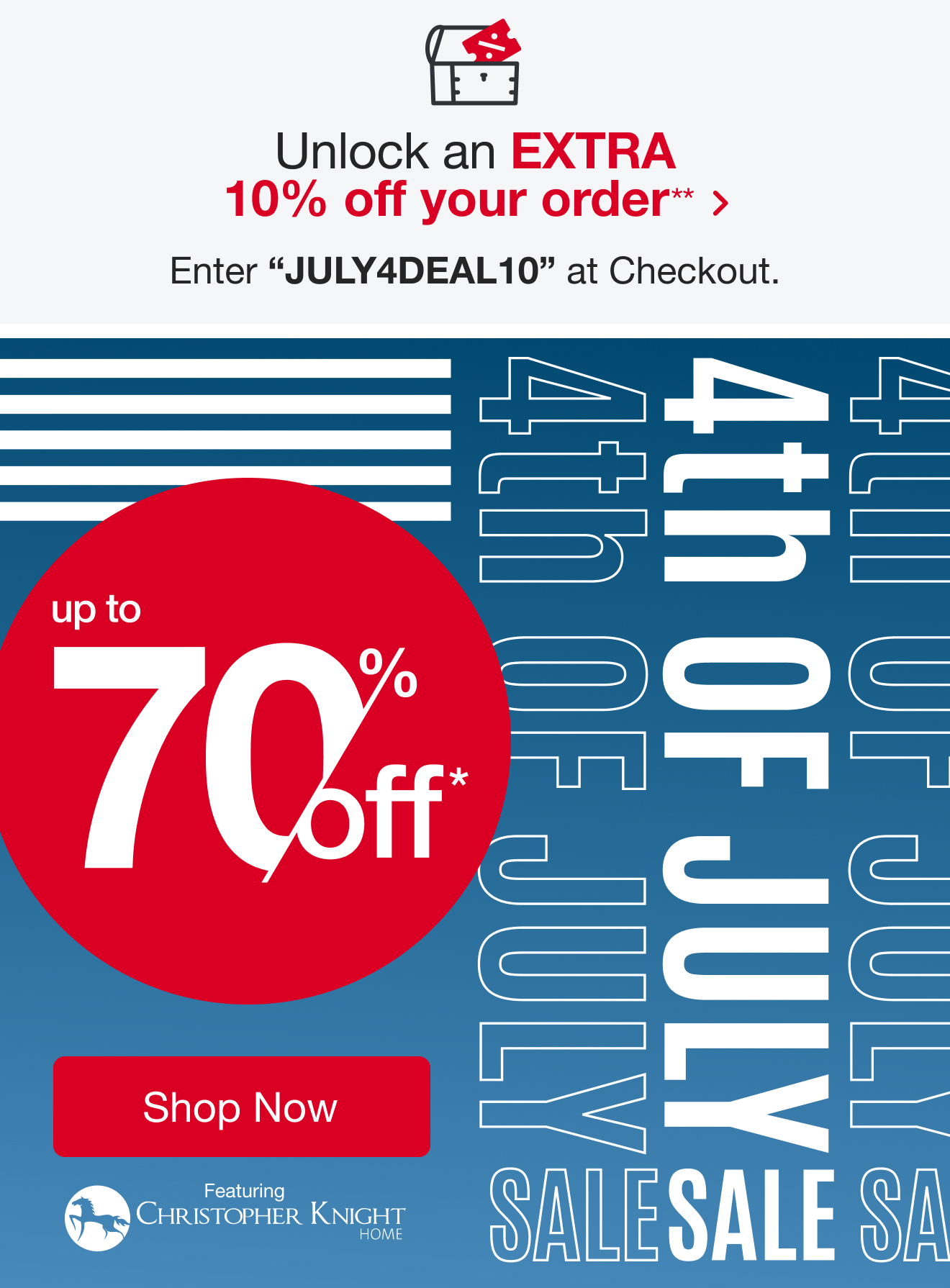 | |  | | | | This message was sent to: kalia1.erieweary@blogger.com | | | | **10% off Coupon may only be used once and cannot be combined with any other offer nor past purchases. For qualifying items, product page price will show, "Today After Coupon". Applies to items in current site promotions. Total discount limited to $5,000. Purchases of gift cards and Welcome RewardsMemberships are not included. Discount appears at checkout. See site for details, exclusions and limitations. Code JULY4DEAL10 automatically applies to items in cart at checkout. Not redeemable on bedbathandbeyond.com. Offer subject to end at any time. Offer ends June 29, 2024 11:59 PM MDT. | | | | | *Subject to limitations or restrictions. See site for details | | ºFeatured Products are sponsored ads that are relevant to you. | | | Products and prices subject to change. Offer, products and prices may not be available for international customers. See website for details. | | | | Beyond, Overstock, and Overstock.com are trademarks and service marks of Beyond, Inc. Any trademarks used in connection with products or services appearing on this email or the website are the property of their respective owners. See Terms & Conditions for more information. |