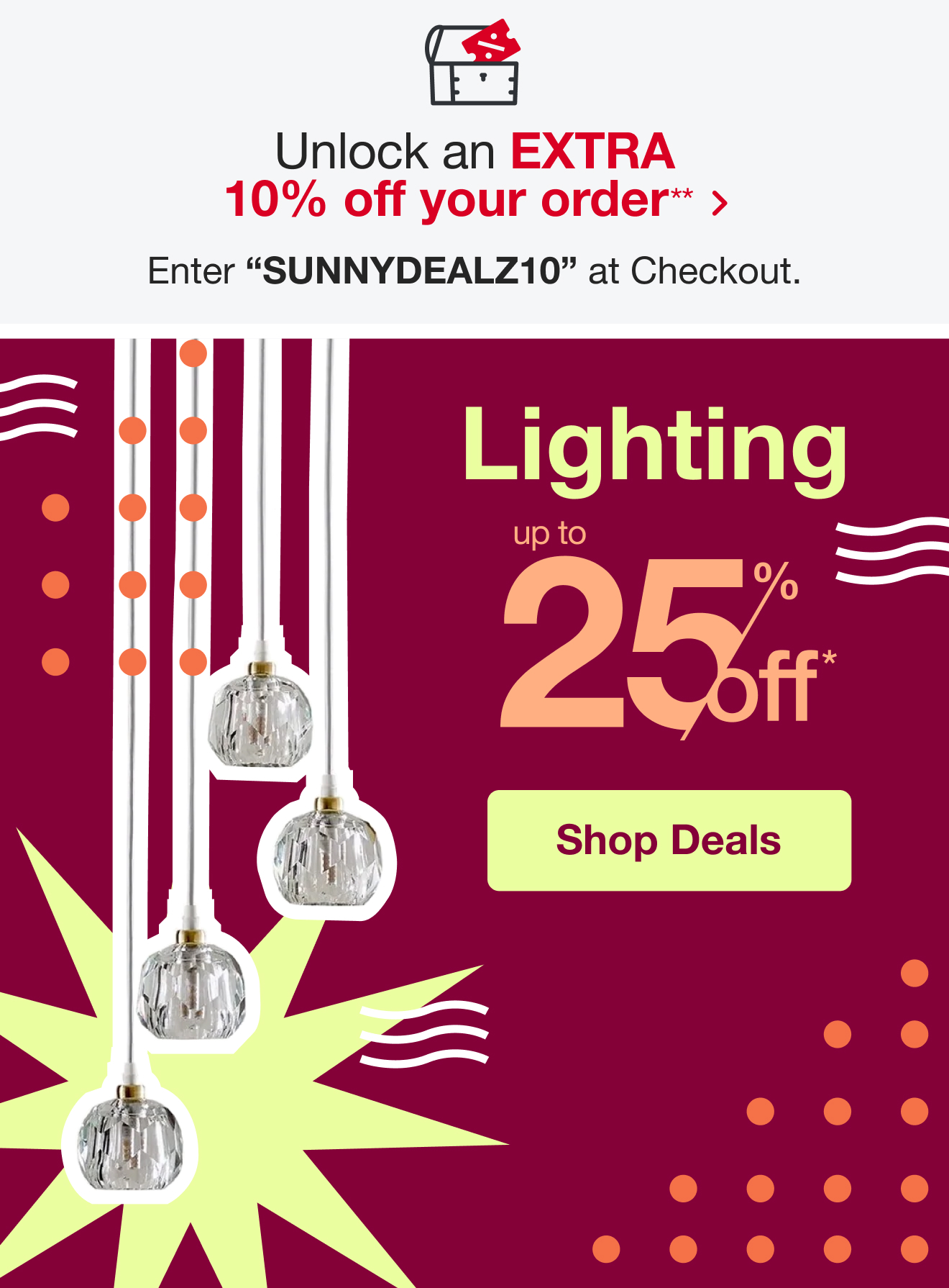 Overstock | | | Top Outdoor Lighting Deals | | | | | | Top Indoor Lighting Deals | | | | |  | | | | This message was sent to: kalia1.erieweary@blogger.com | | | | **10% off Coupon may only be used once and cannot be combined with any other offer nor past purchases. For qualifying items, product page price will show, "Today After Coupon". Applies to items in current site promotions. Total discount limited to $5,000. Purchases of gift cards and Welcome RewardsMemberships are not included. Discount appears at checkout. See site for details, exclusions and limitations. Code SUNNYDEALZ10 automatically applies to items in cart at checkout. Not redeemable on bedbathandbeyond.com. Offer subject to end at any time. Offer ends June 14, 2024 11:59 PM MDT. | | | | | *Subject to limitations or restrictions. See site for details | | ºFeatured Products are sponsored ads that are relevant to you. | | | Products and prices subject to change. Offer, products and prices may not be available for international customers. See website for details. | | | | Beyond, Overstock, and Overstock.com are trademarks and service marks of Beyond, Inc. Any trademarks used in connection with products or services appearing on this email or the website are the property of their respective owners. See Terms & Conditions for more information. |
