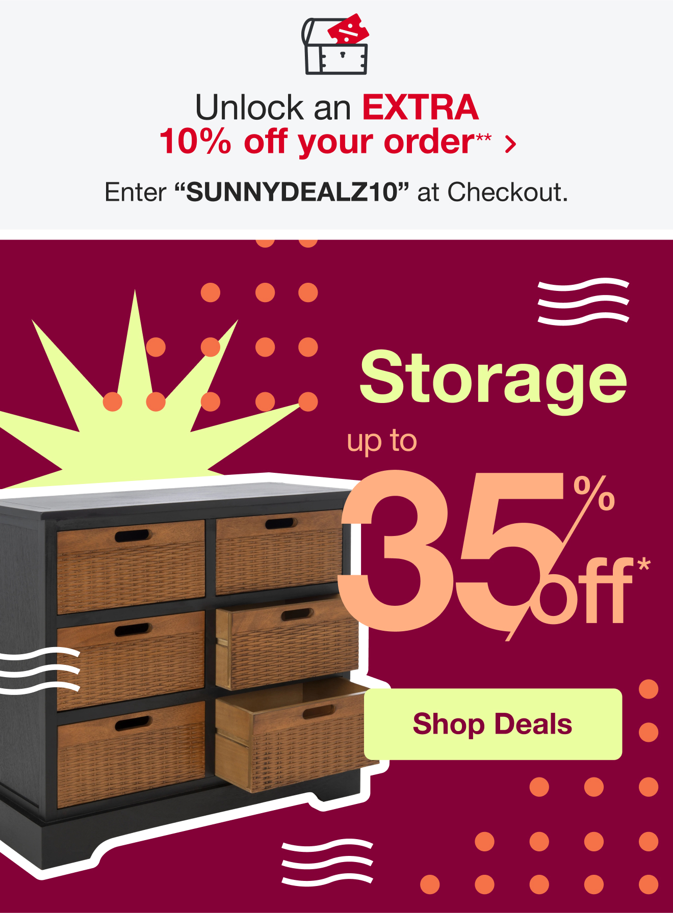 | |  | | | | This message was sent to: kalia1.erieweary@blogger.com | | | | **10% off Coupon may only be used once and cannot be combined with any other offer nor past purchases. For qualifying items, product page price will show, "Today After Coupon". Applies to items in current site promotions. Total discount limited to $5,000. Purchases of gift cards and Welcome RewardsMemberships are not included. Discount appears at checkout. See site for details, exclusions and limitations. Code SUNNYDEALZ10 automatically applies to items in cart at checkout. Not redeemable on bedbathandbeyond.com. Offer subject to end at any time. Offer ends June 12, 2024 11:59 PM MDT. | | | | | *Subject to limitations or restrictions. See site for details | | ºFeatured Products are sponsored ads that are relevant to you. | | | Products and prices subject to change. Offer, products and prices may not be available for international customers. See website for details. | | | | Beyond, Overstock, and Overstock.com are trademarks and service marks of Beyond, Inc. Any trademarks used in connection with products or services appearing on this email or the website are the property of their respective owners. See Terms & Conditions for more information. |