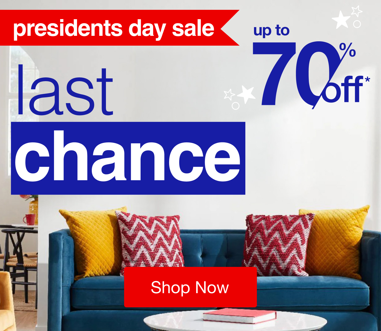 Overstock | | | Last Chance Furniture Deals | | | | |  | | | | This message was sent to: kalia1.erieweary@blogger.com | | | | **10% off Coupon may only be used once and cannot be combined with any other offer nor past purchases. For qualifying items, product page price will show, "Today After Coupon". Applies to items in current site promotions. Total discount limited to $5,000. Purchases of gift cards and Welcome RewardsMemberships are not included. Discount appears at checkout. See site for details, exclusions and limitations. Code PRESDAYSALE10 automatically applies to items in cart at checkout. Not redeemable on bedbathandbeyond.com. Offer subject to end at any time. Offer ends February 19, 2025 11:59 PM MST. | | | | | *Subject to limitations or restrictions. See site for details | | ΒΊFeatured Products are sponsored ads that are relevant to you. | | | Products and prices subject to change. Offer, products and prices may not be available for international customers. See website for details. | | | | Bed Bath & Beyond, Overstock, and Overstock.com are trademarks and service marks of Beyond, Inc. Any trademarks used in connection with products or services appearing on this email or the website are the property of their respective owners. See Terms & Conditions for more information. |
