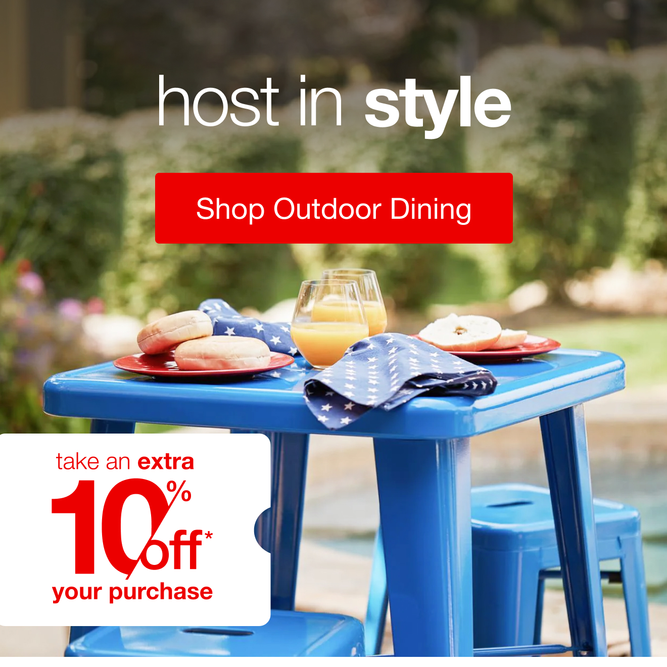 Take an EXTRA 10% off outdoor dining, seating, grills & more.
