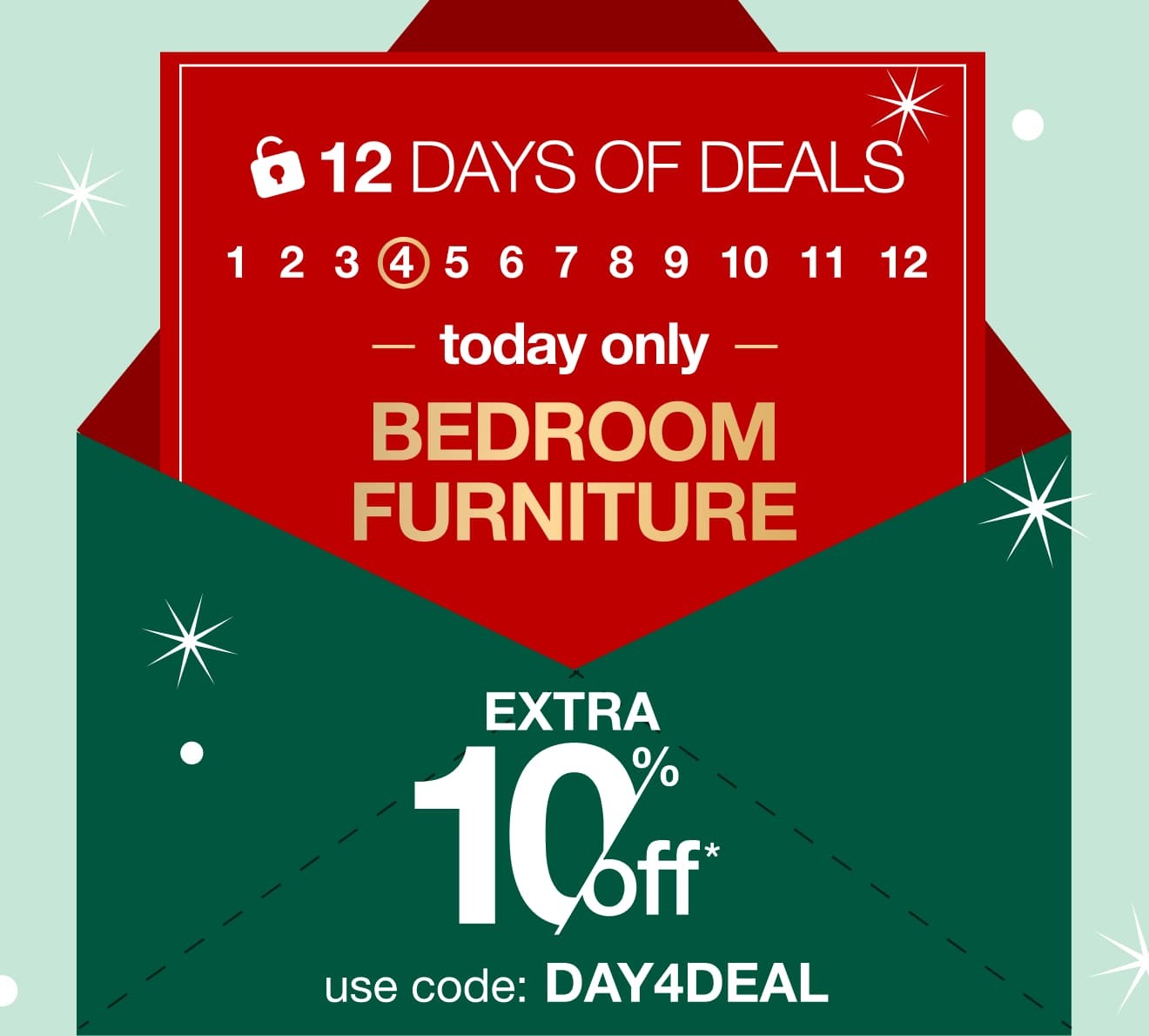 | | This message was sent to: kalia1.erieweary@blogger.com | | | | **Extra 10% off Bedroom Furniture may only be used once and cannot be combined with any other offer nor past purchases. Total discount limited to $5,000. Purchases of gift cards and welcome rewards+ memberships are not included. Valid only on select styles, other exclusions may apply. For qualifying items, product page price will show, See site for details, exclusions and limitations. Use code DAY4DEAL at checkout. Not redeemable on bedbathandbeyond.com. Offer ends December 8, 2025 11:59 PM MT, but may be subject to end at any time prior. | | | | | The "order by" date is based on the best estimates available from our shipping partners but is not a guarantee of delivery by December 25th. |